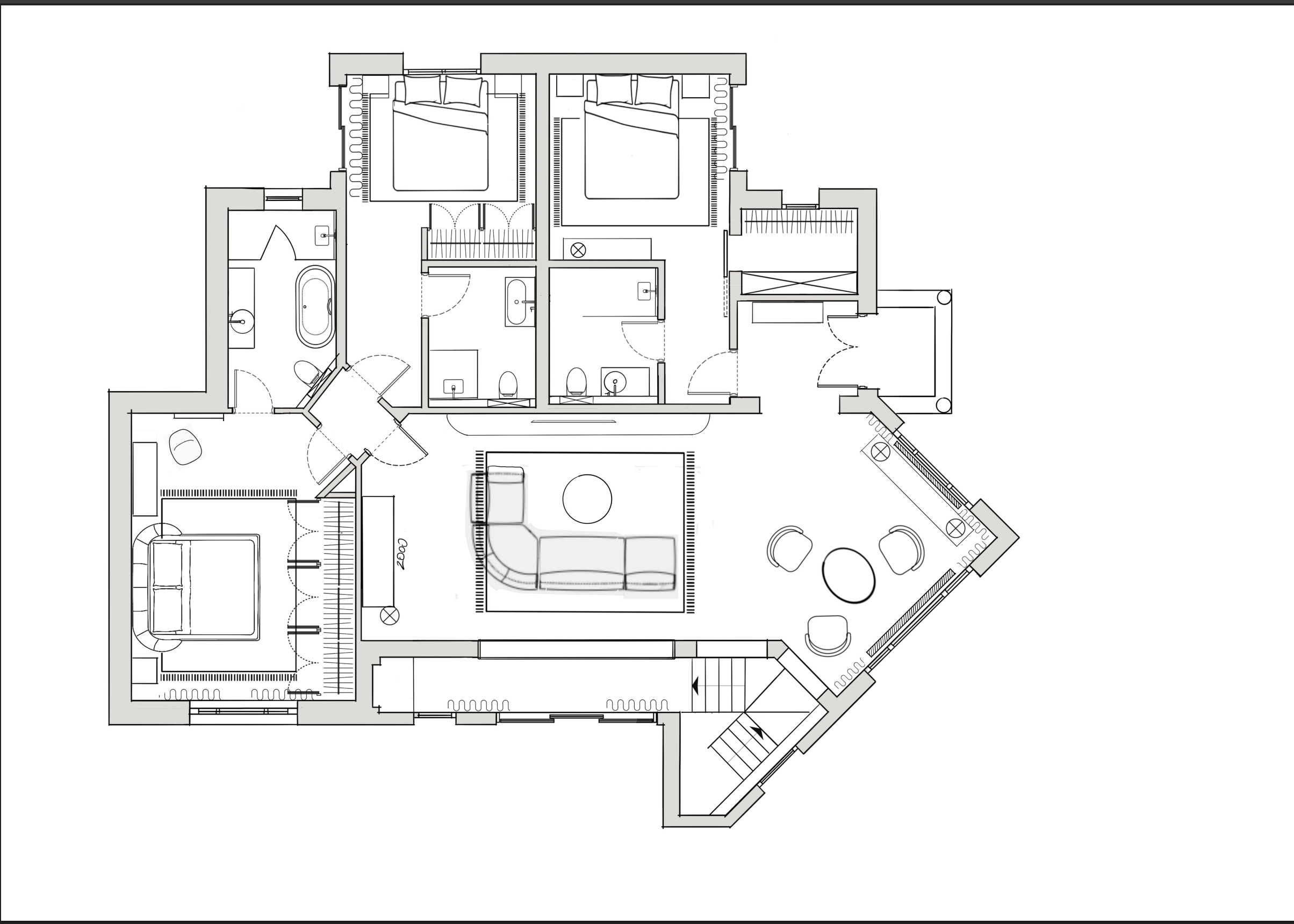 The interiors are fully furnished with handpicked design pieces from leading European manufacturers, reflecting a commitment to comfort and style. Saba Italia offers modular sofas that embody softness and freedom of form, while Ditre Italia and Twils supply beds with tailored elegance and orthopedic comfort. Zanotta, a symbol of timeless Italian design, and Mogg, with its bold artistic objects, bring personality to the spaces. Northern European brands such as &Tradition (Denmark), Punt Mobles (Spain), Layered (Sweden), Hay (Denmark), and Ferm Living (Denmark) contribute accessories, rugs, and accents that emphasize Scandinavian clarity and Mediterranean warmth.